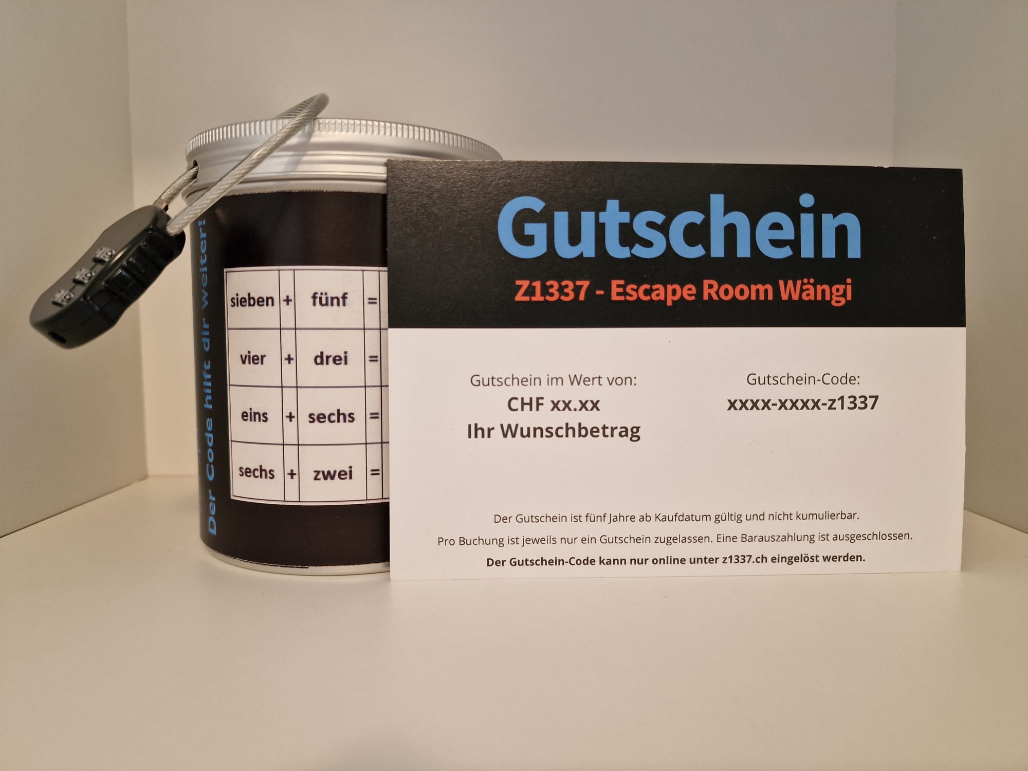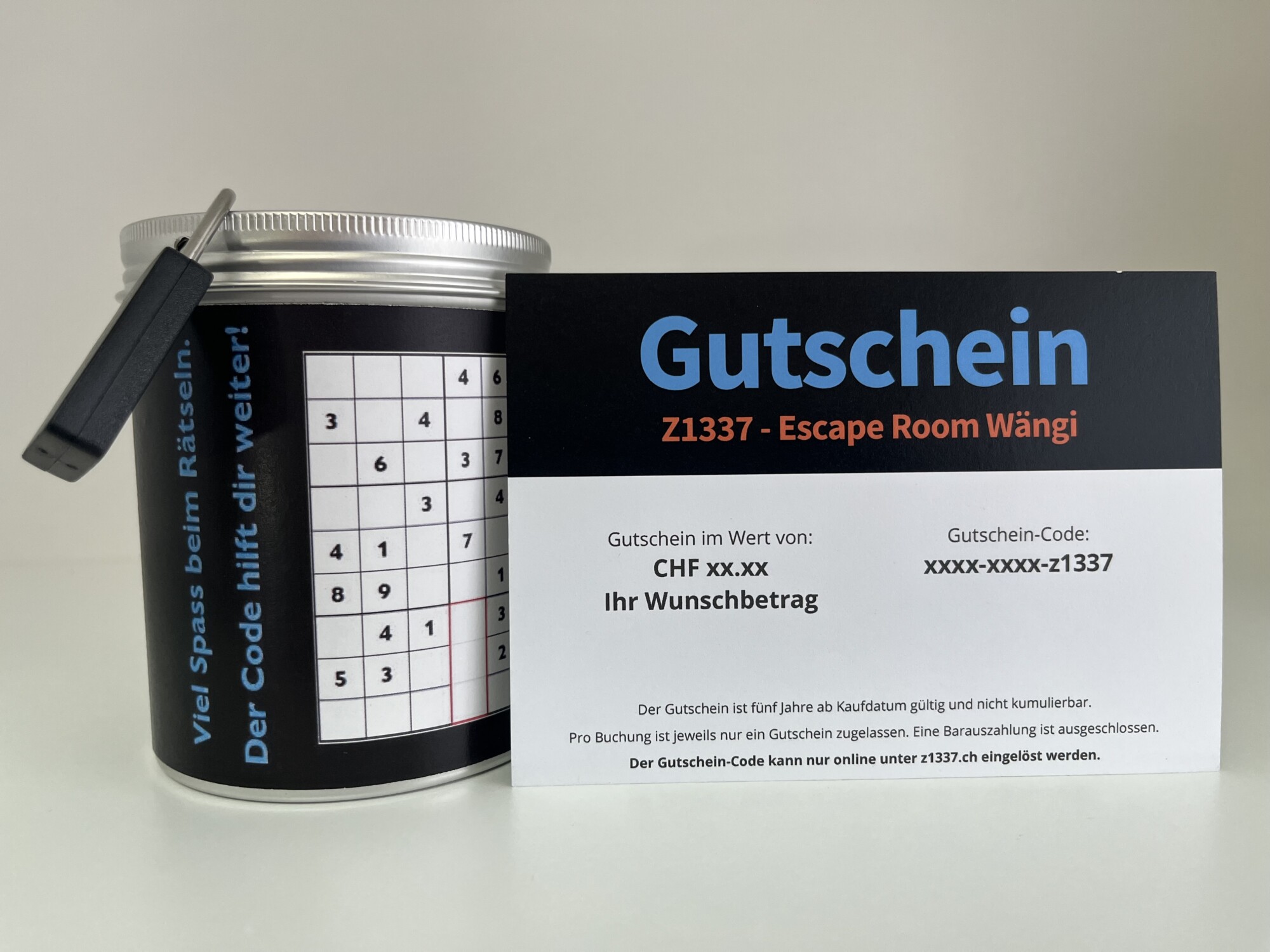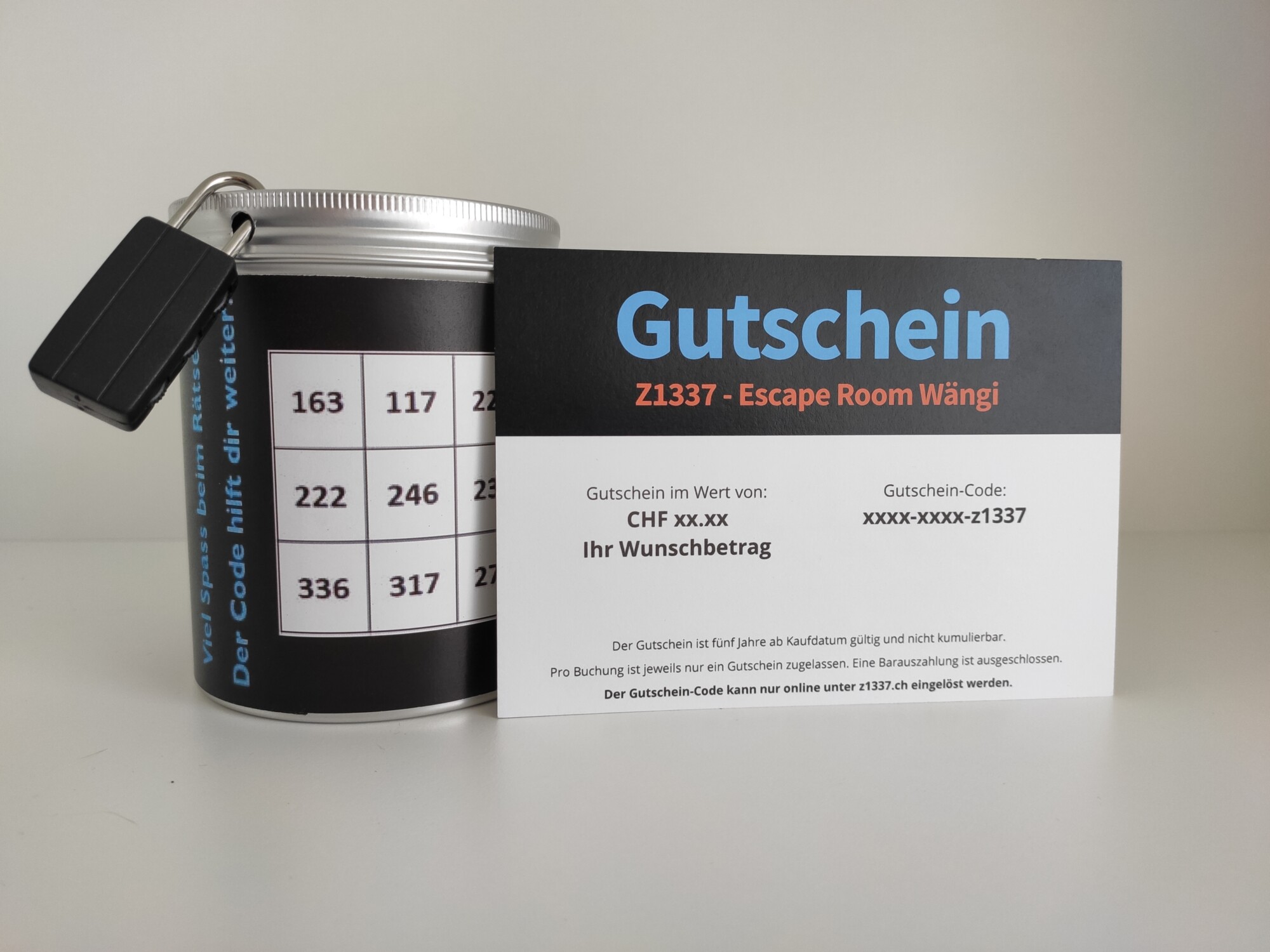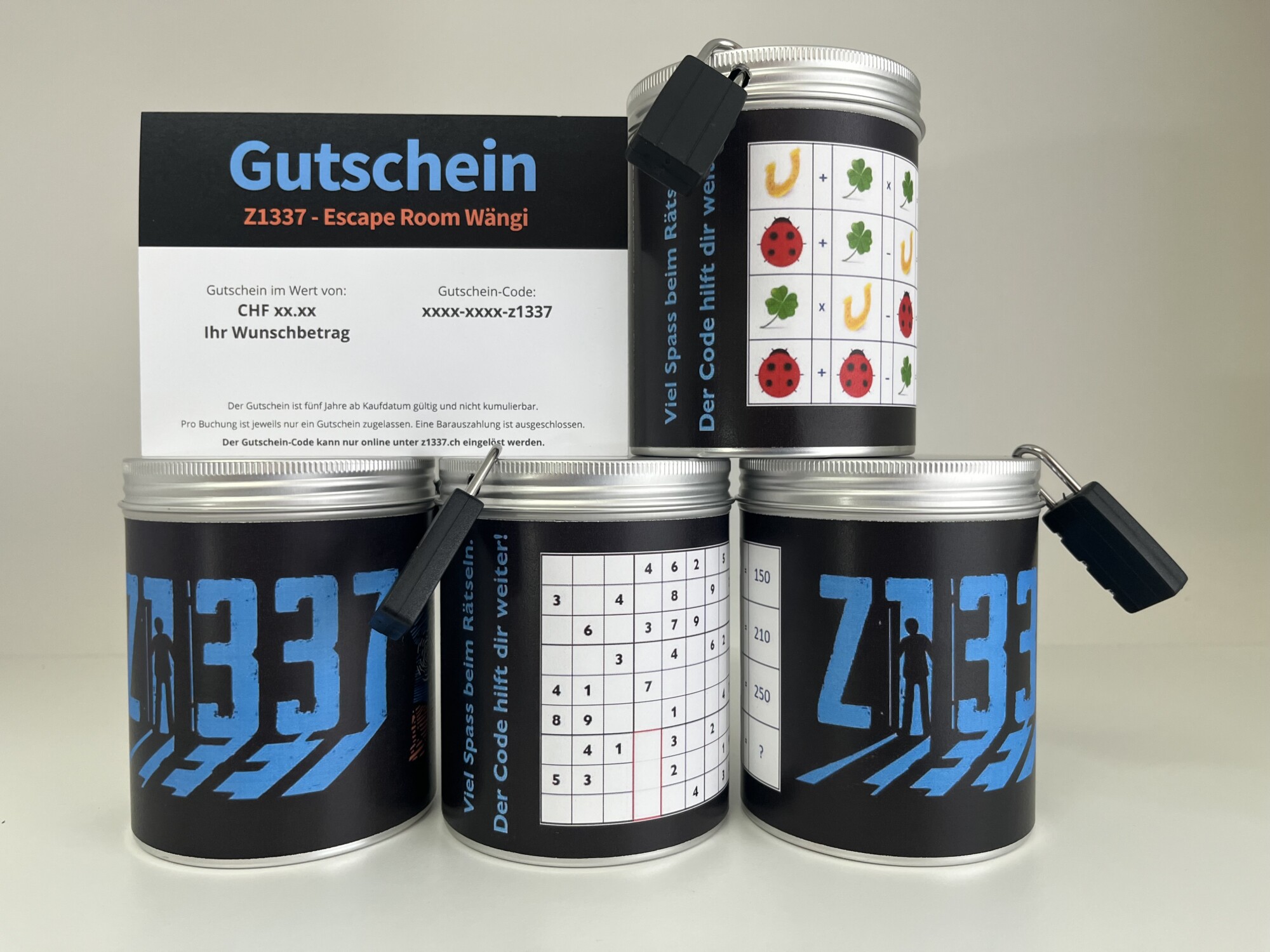 Wie wäre es mit einer Rätsel-Geschenkdose mit Zahlenschloss? Darin enthalten sind dein(e) Z1337-Geschenkgutschein(e) zusammen mit unseren Flyern. Selbstverständlich kannst du die Dose selbst noch individuell, z.B. mit Süssigkeiten, füllen. Wir bieten auch „nur“ die Rätseldosen, ohne Gutscheine, an.
